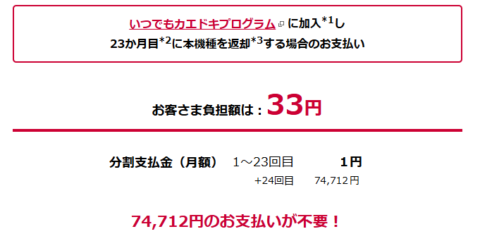 1回目は11円、2~23回払いまでは月1円、24ヶ月目に本体を返却すれば残債免除になります。